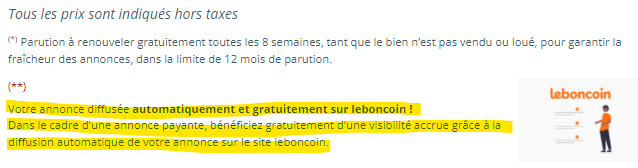 La diffusion vers leboncoin est maintenant systématique depuis le 9 février 2022, et il en est fait mention dès le début de la saisie de l'annonce, après avoir sélectionné la rubrique :